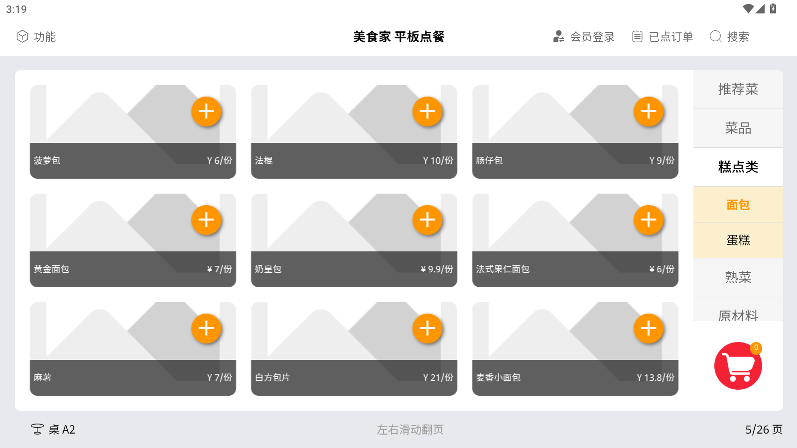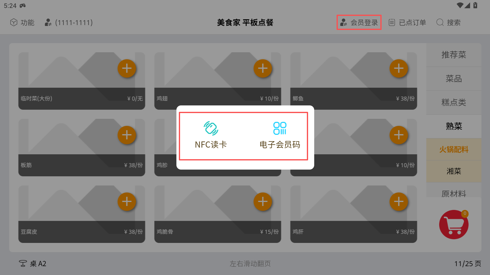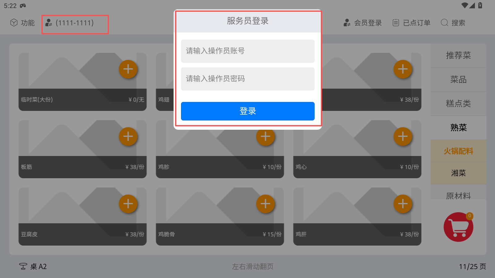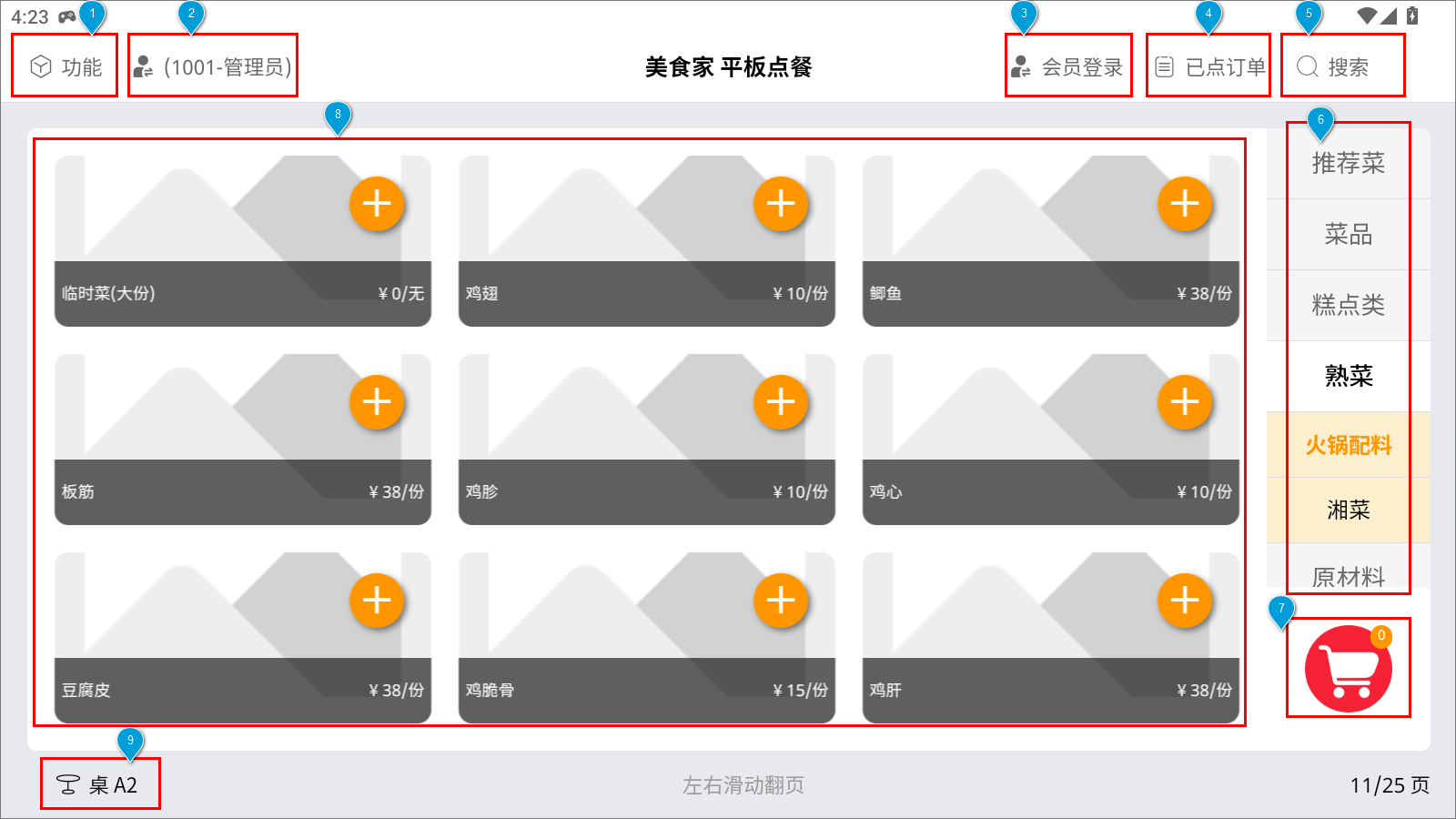 功能描述:点餐界面包括①功能、②切换服务员账号、③会员登录、④已点订单、⑤搜索、⑥菜品类别、⑦购物车、⑧菜品信息、⑨选择桌号等九个模块