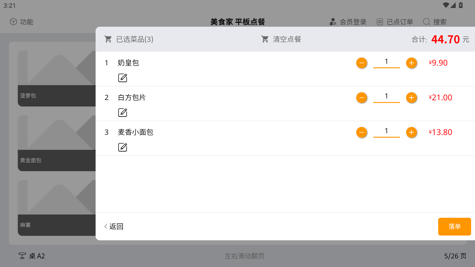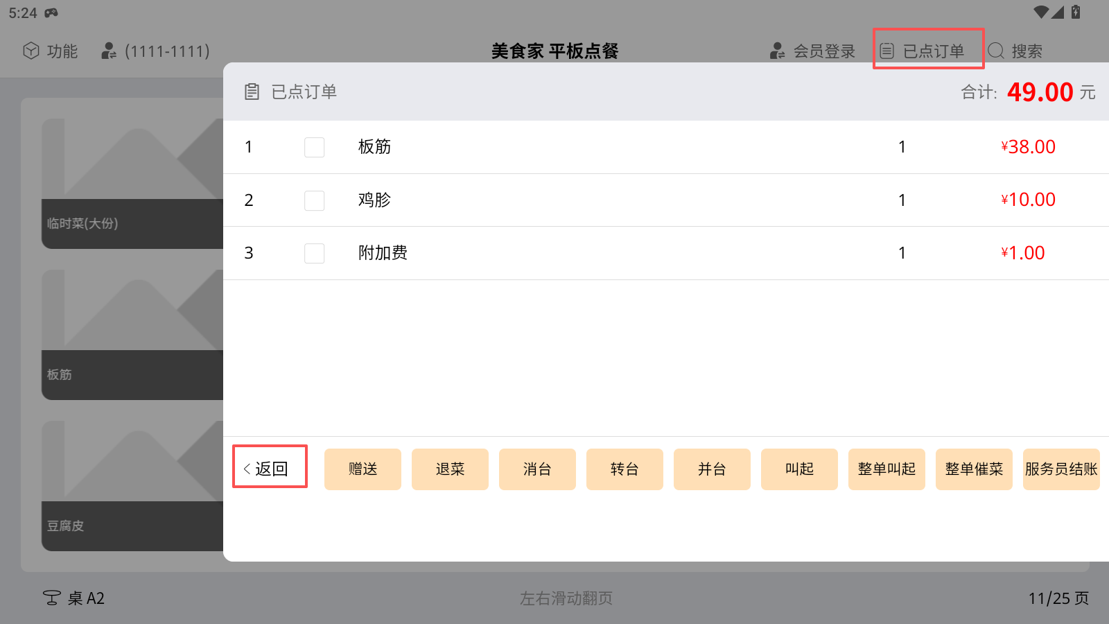 查看已落单的菜品,服务员模式下,可退菜、消台等。