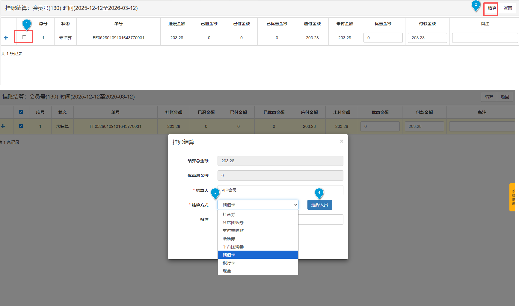 1、进入挂账会员结算