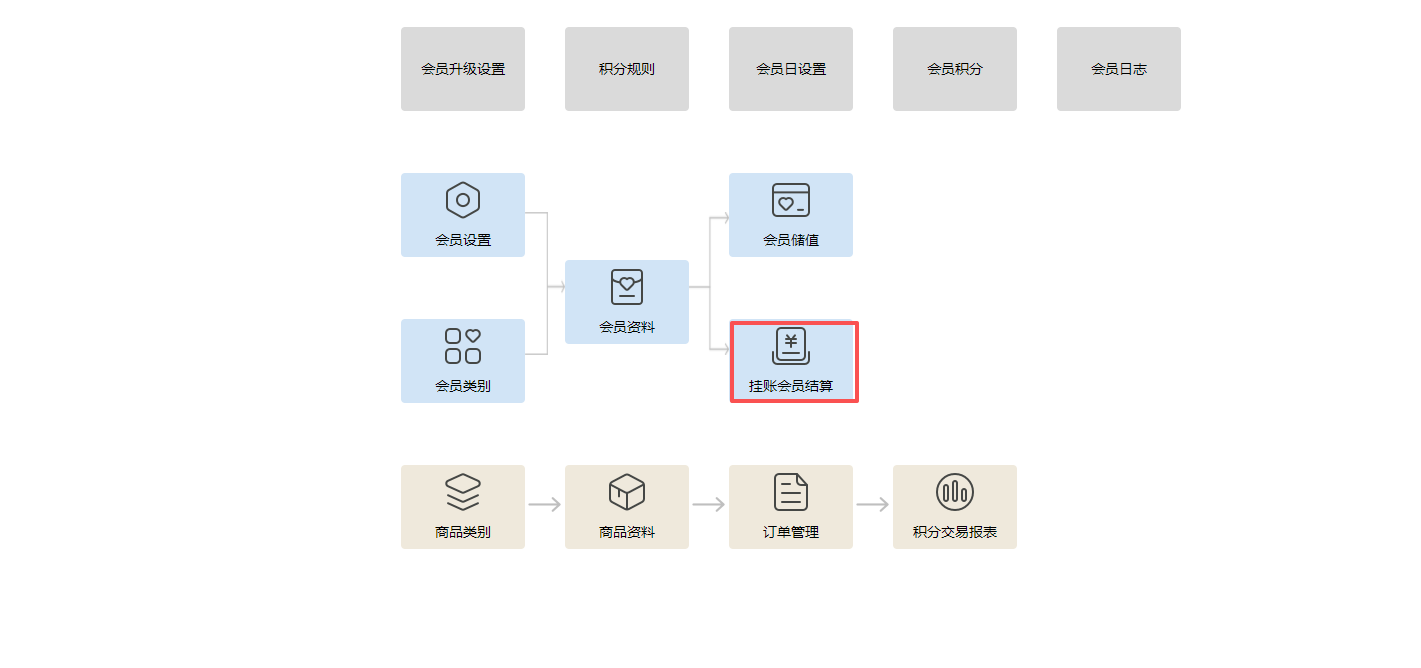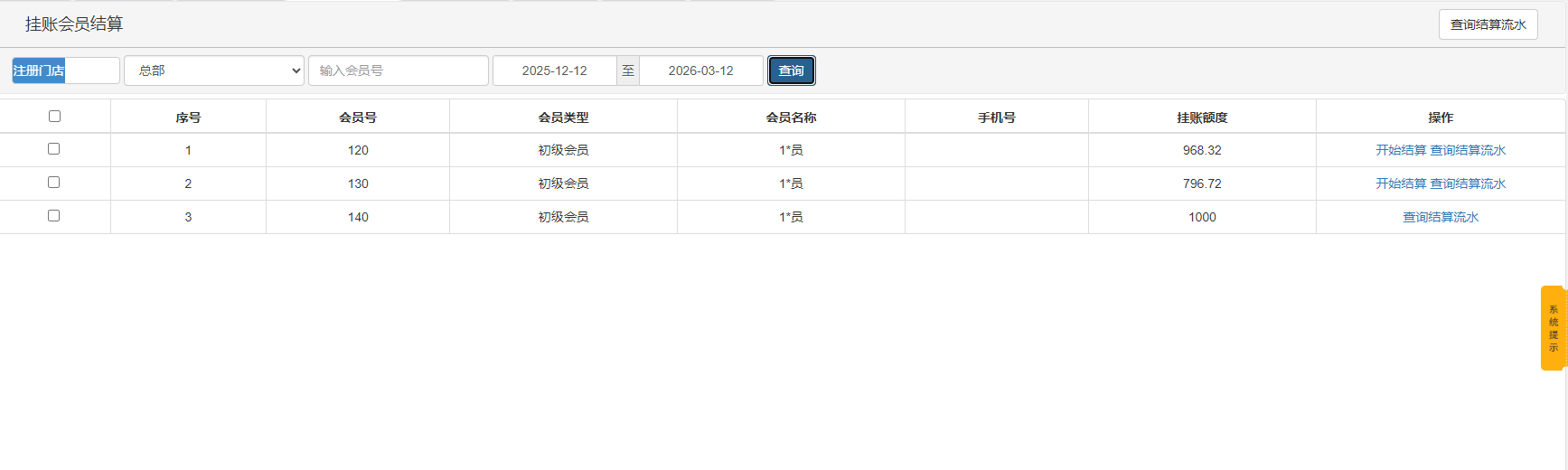功能概述:挂账会员结算模块用于管理会员的挂账账户,支持查询会员挂账额度、进行挂账结算以及查看结算流水。此功能适用于允许会员先消费后付款的场景,帮助企业有效管理应收账款。