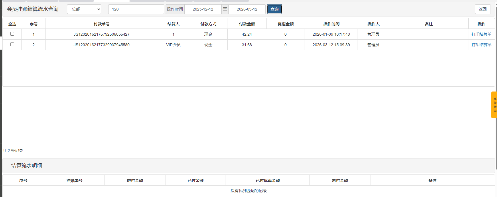 点击目标会员的【查询结算流水】按钮,进入结算流水界面,可查看该会员的历史结算记录,包括结算时间、结算金额、结算方式等信息。