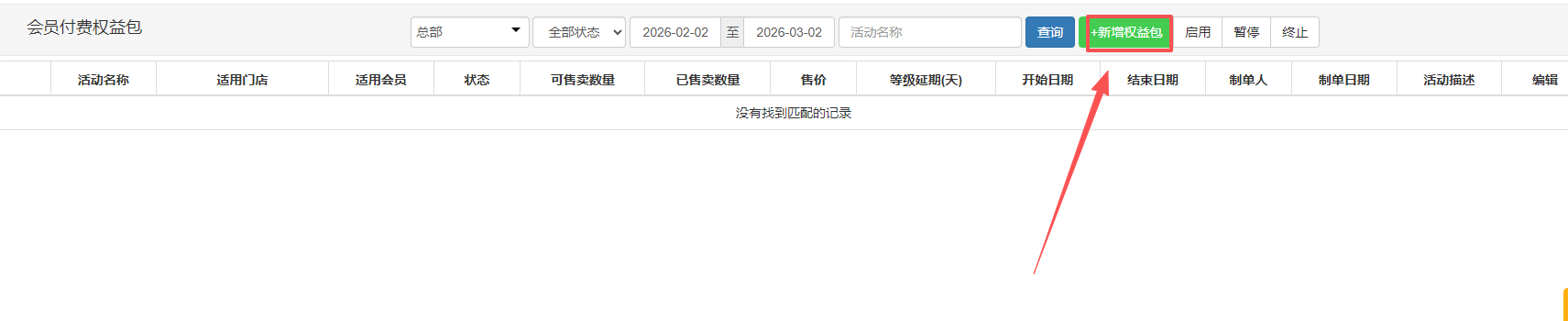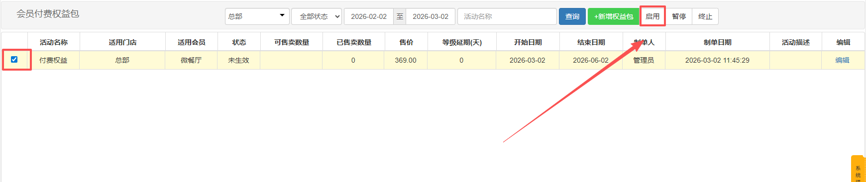 权益包新增并保存后,默认处于“未启用”状态。需手动点击【启用】,方可上线销售。
