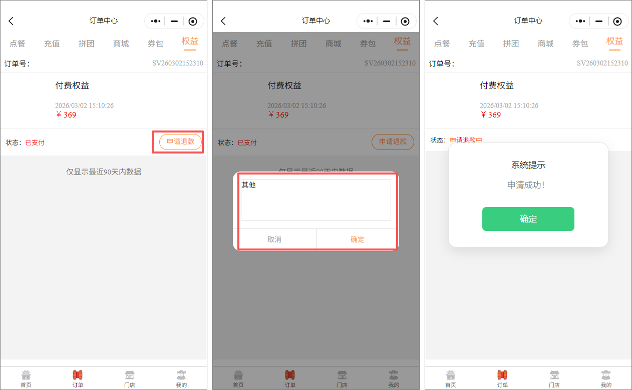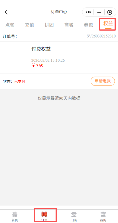 小程序查询:会员在“微餐厅”小程序中,进入【订单】->【权益】,可查看自己的购买记录。