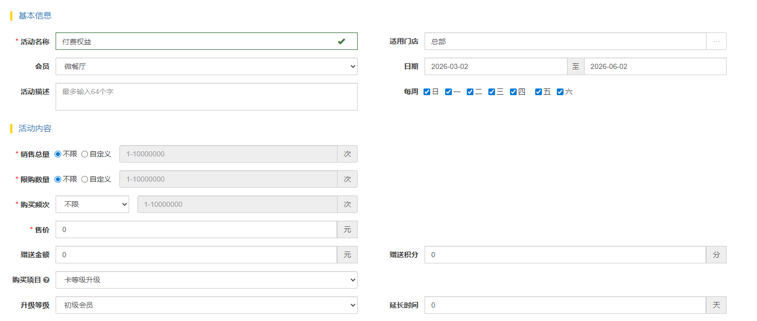 功能概述:“会员付费权益”是一项增值服务工具,允许会员通过购买付费权益包来升级会员等级或延长现有等级的有效期。购买后,会员可立即获得预设的赠送金额、积分及优惠券,从而享受更高的会员折扣与专属福利。