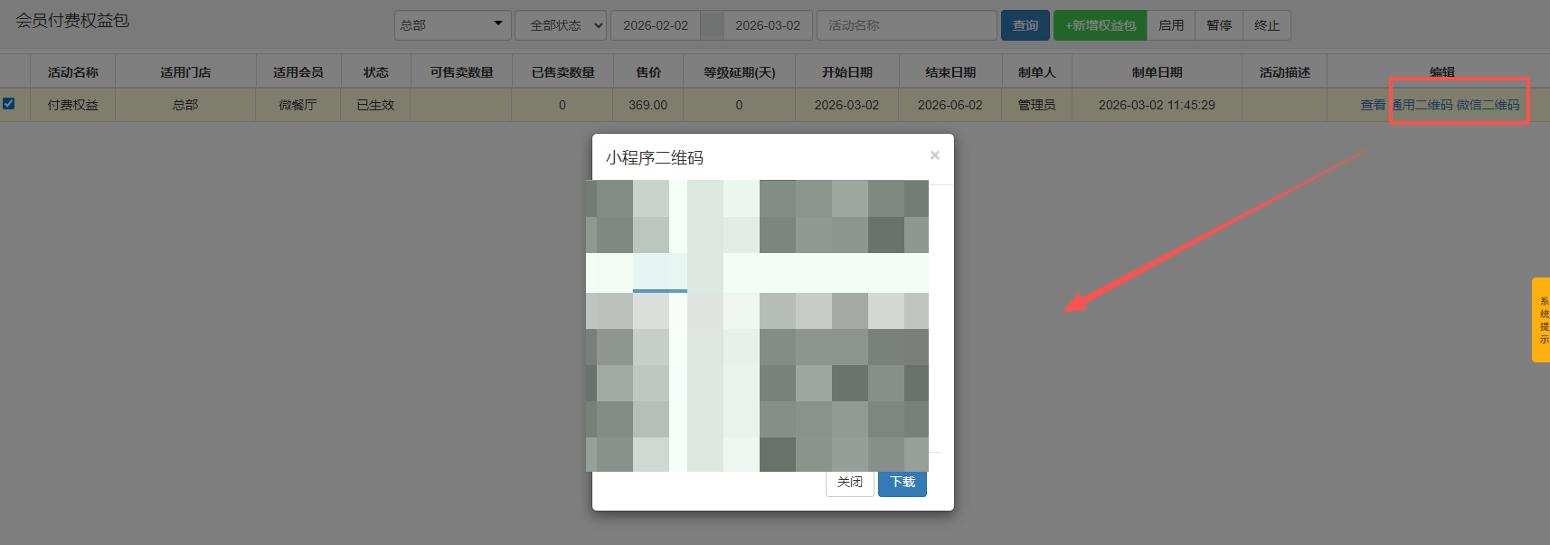 权益包启用后,可下载通用二维码或微信二维码,会员直接扫码即可进入购买页面完成支付。