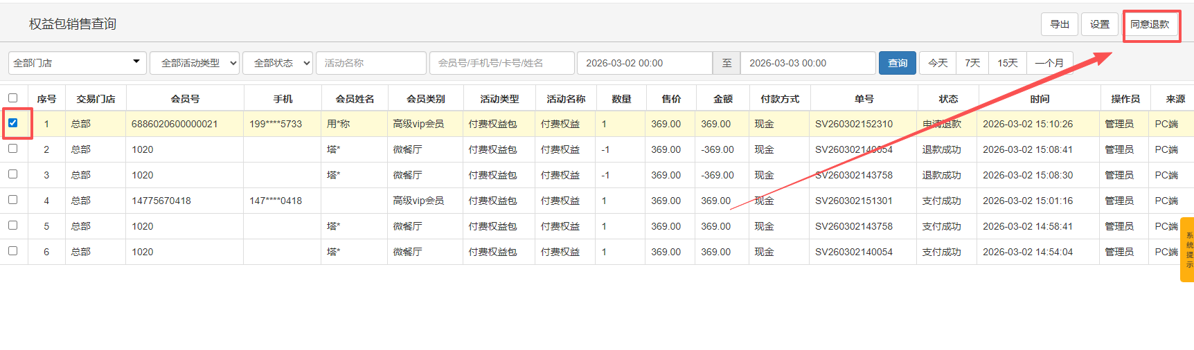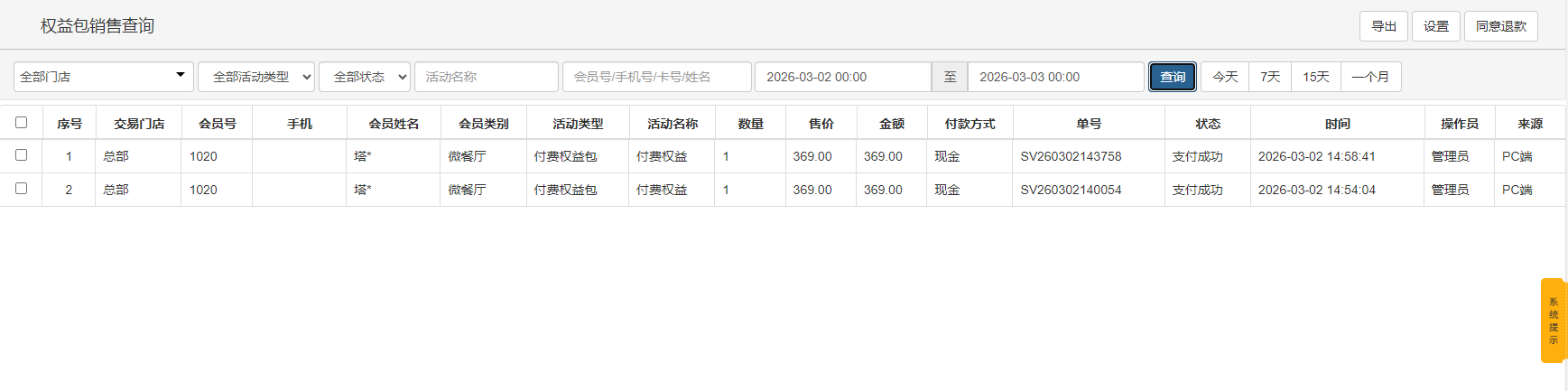 后台查询:进入【营销中心】->【权益包销售查询报表】,可查看所有购买记录,包括会员信息、购买时间、支付金额等。
