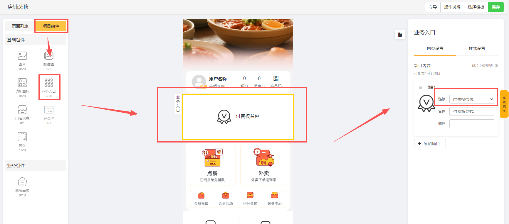 配置入口:需先在【微餐厅设置】->【店铺装修模板】的“项目组件”中,添加“付费权益包”业务入口。