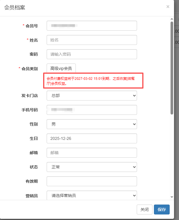 在后台【会员档案】中,可查看会员购买权益包后的等级有效期及到期时间。