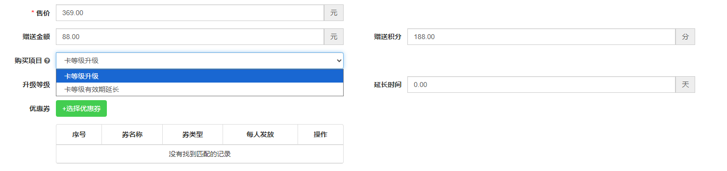 若选择“卡等级升级”,需指定升级到的目标会员等级,并可设置等级有效期,过期后自动降回原等级。