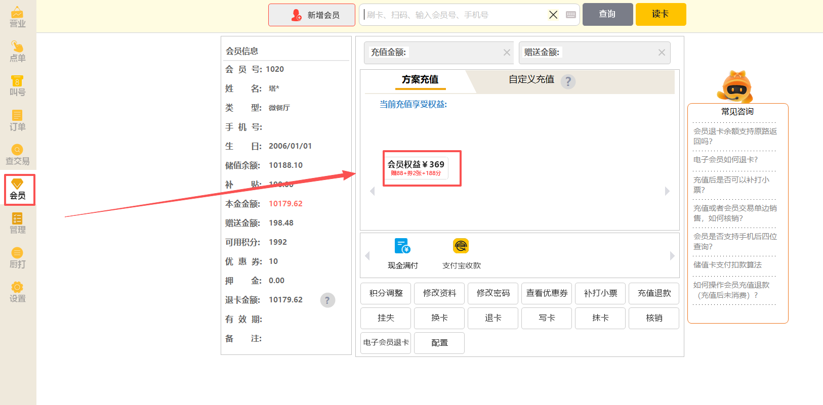 收银员在前台系统查询会员后,可直接为会员操作购买付费权益包。