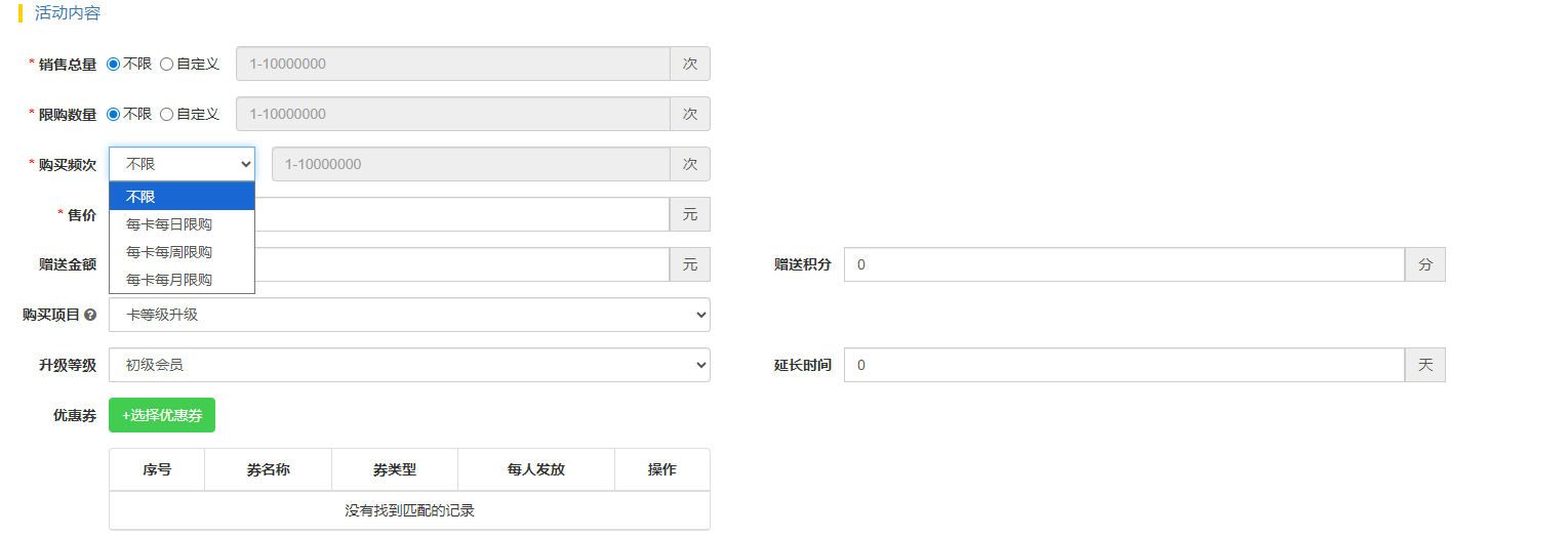 购买频次:限制重复购买的频率,可设置为“每卡每日限购”、“每卡每周限购”、“每卡每月限购”。