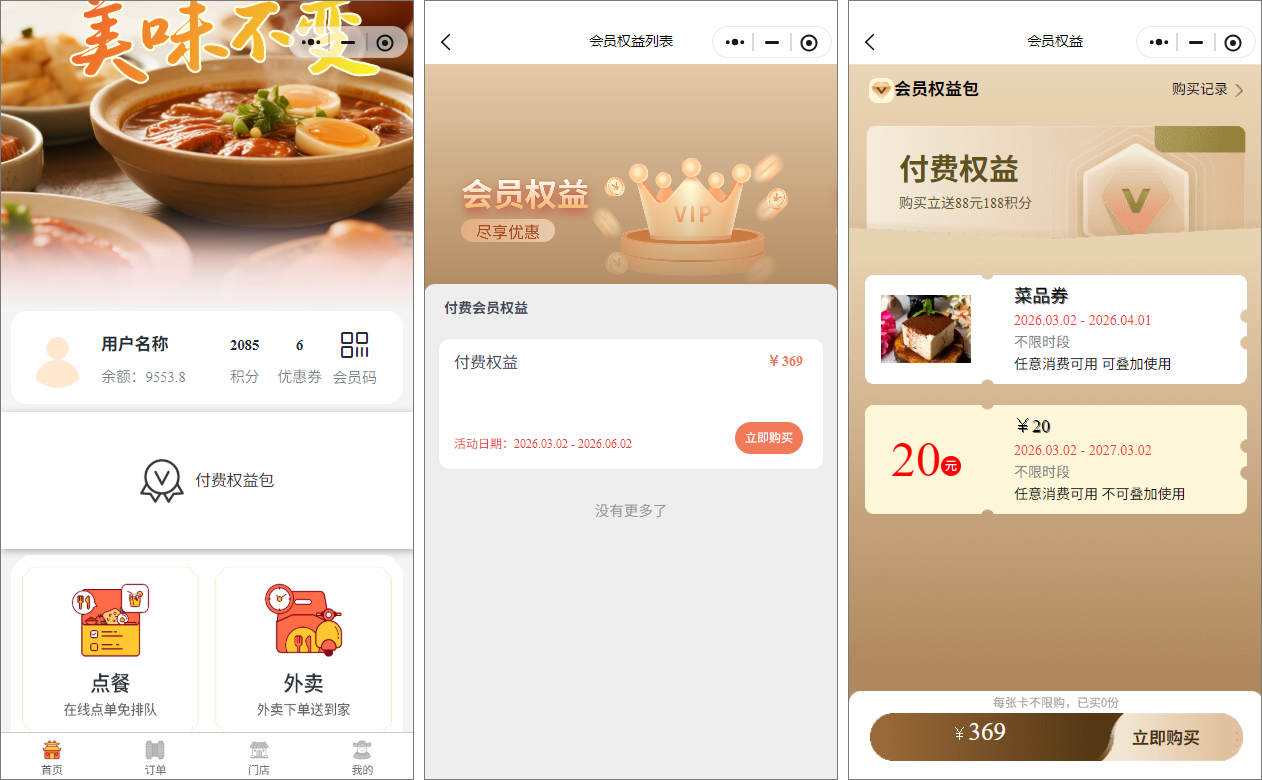 会员购买:会员进入“微餐厅”小程序,点击首页的“付费权益包”入口,选择心仪的权益包进行购买。