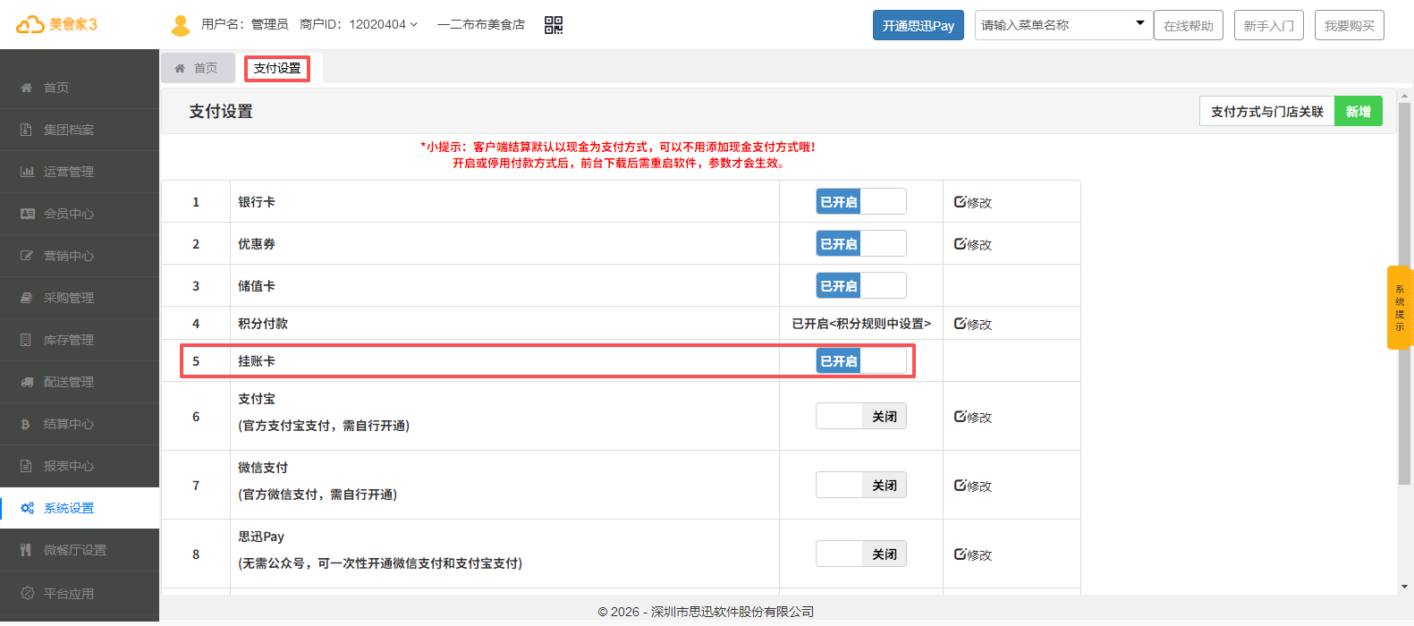 Step3、在系统设置-支付设置中“开启挂账卡”