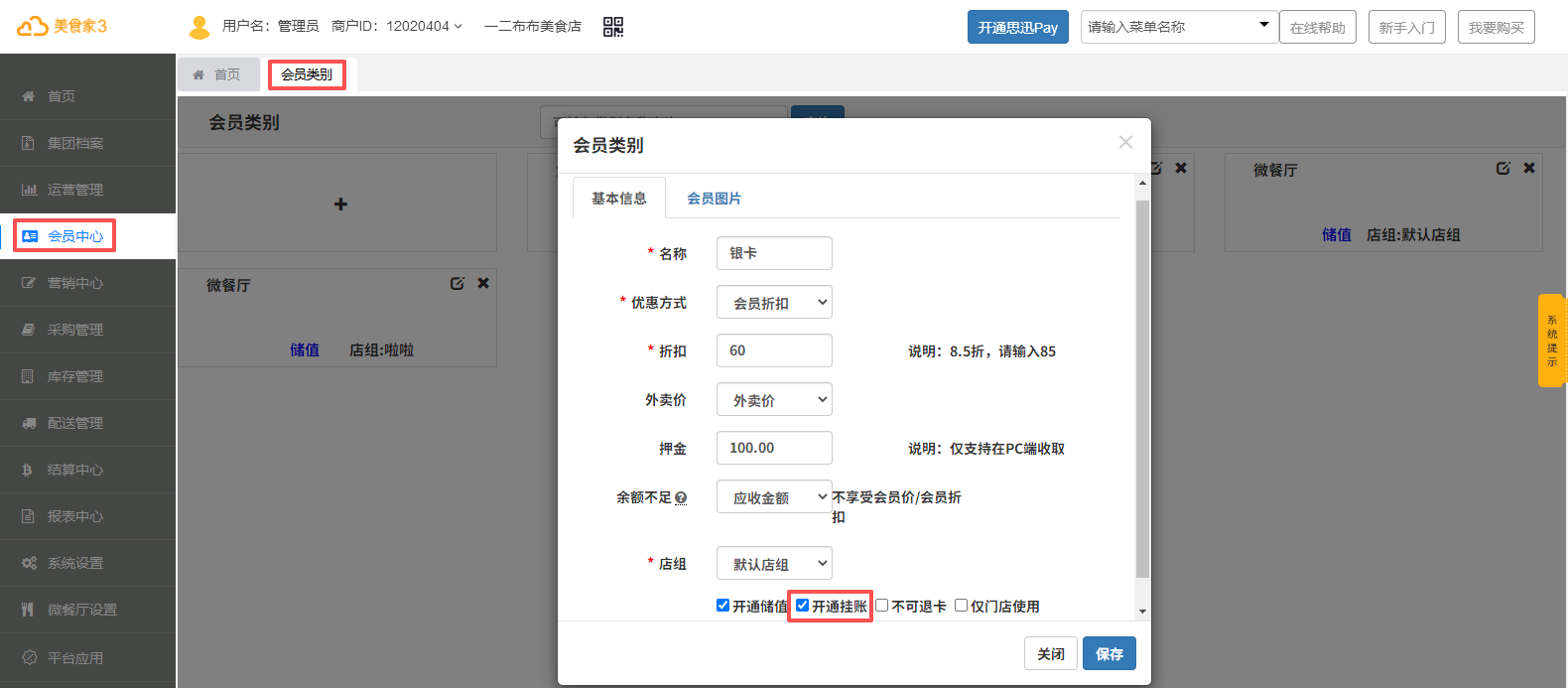 Step1、在会员中心-会员类别中勾选“开通挂账”参数