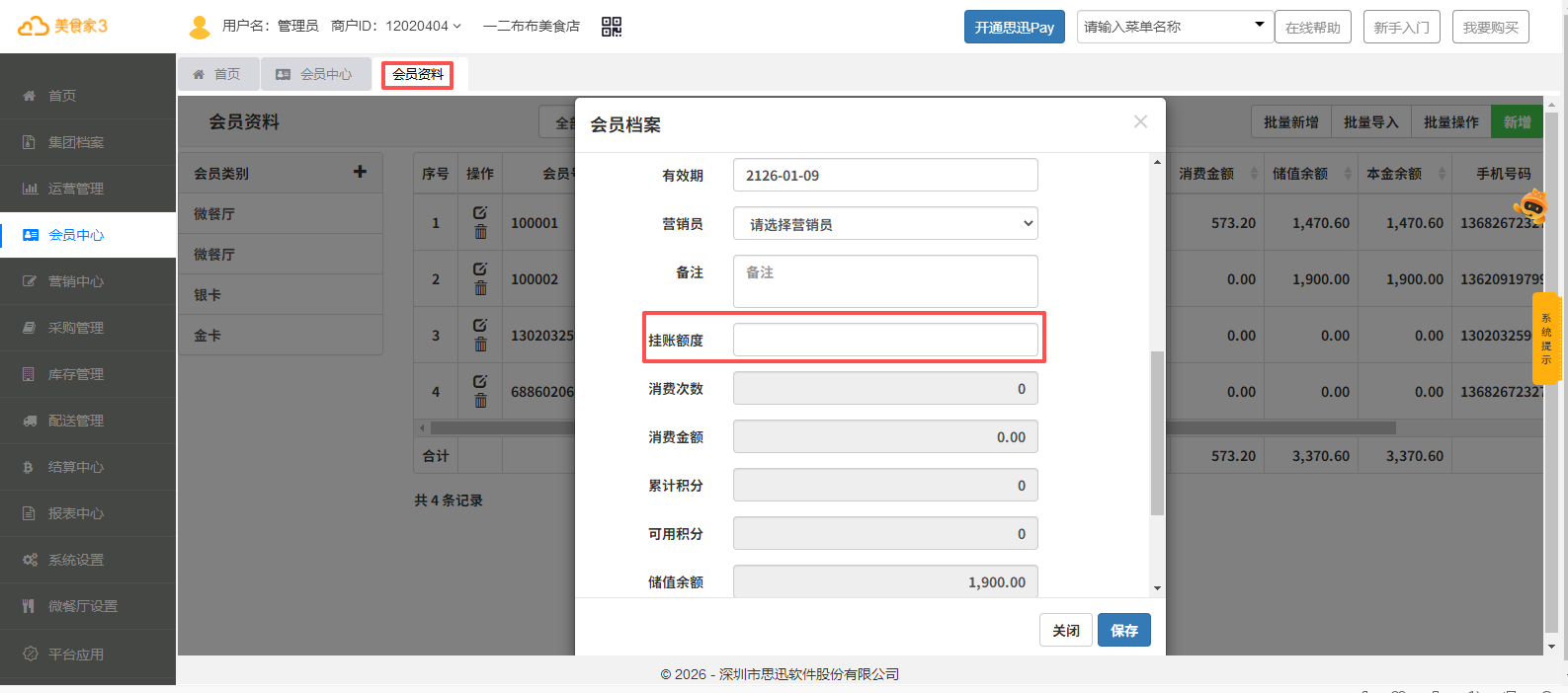 Step2、在会员中心-会员资料中设置“挂账额度”