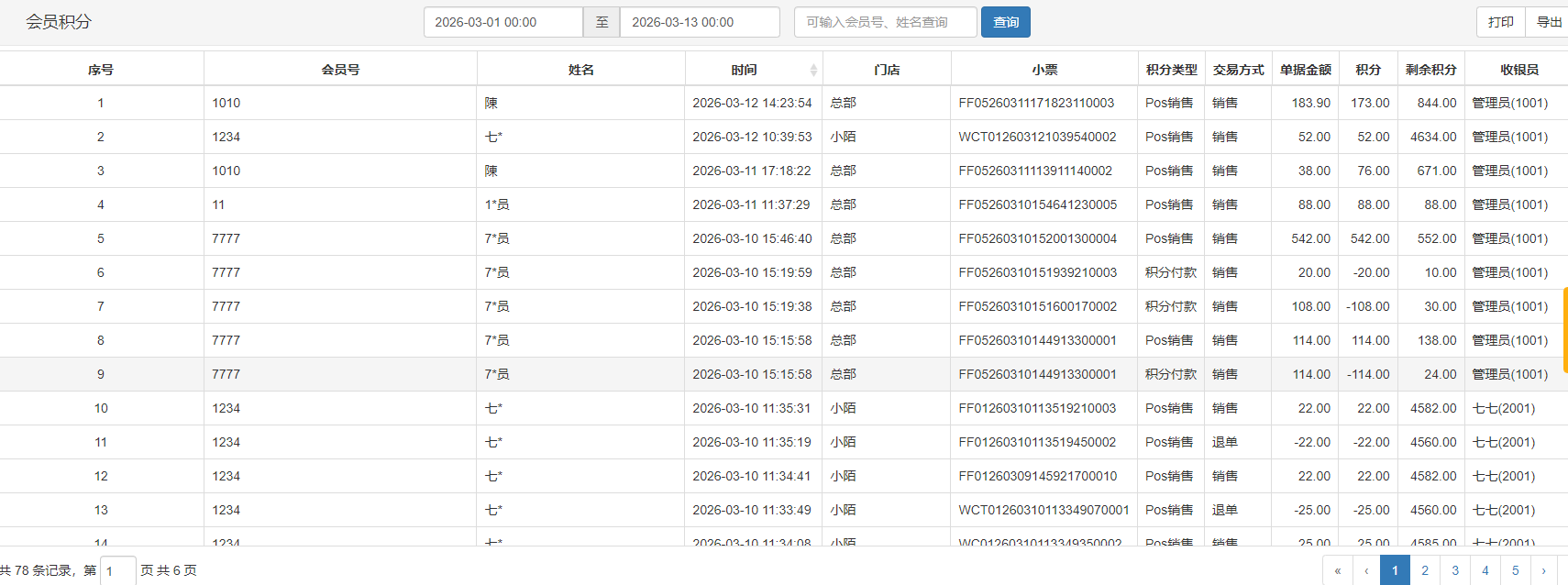 位置: 【会员中心】 -> 【积分报表管理】 -> 【会员积分】 功能概述:会员积分模块用于查看会员的积分变动明细,包括积分获取、积分使用、积分调整等所有流水记录 如图所示 文档更新时间: 2026-03-13 03:26 作者:朱磊君