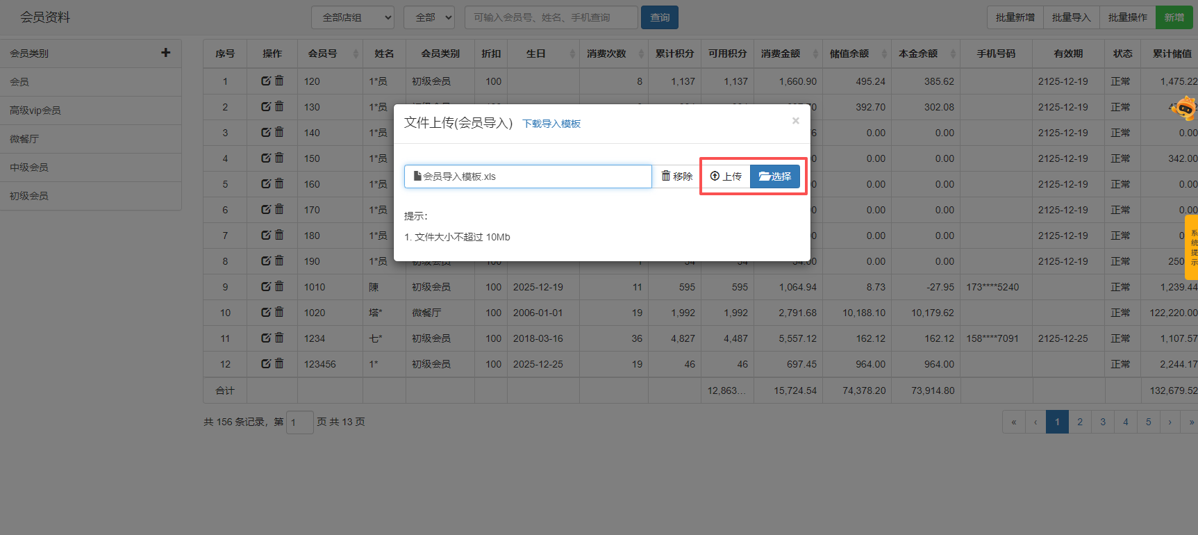 会员类别需填写系统已存在的类别名称,确保一致,手机号需为有效号码,否则可能导入失败。