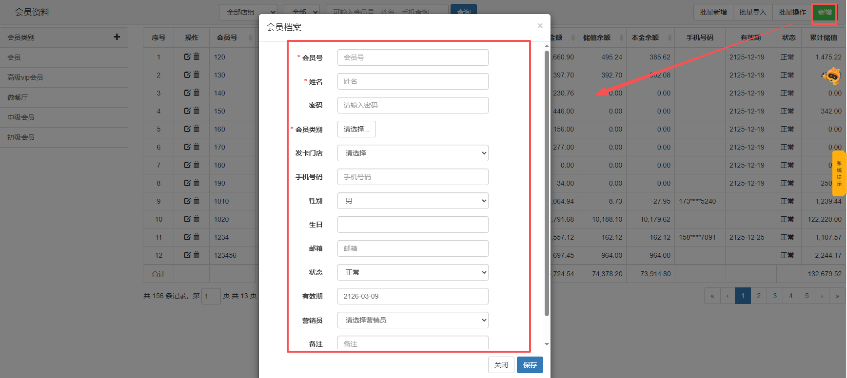 点击【新增】按钮,在弹出的窗口中填写以下信息:填写完成后,点击【保存】,即可成功新增会员。
