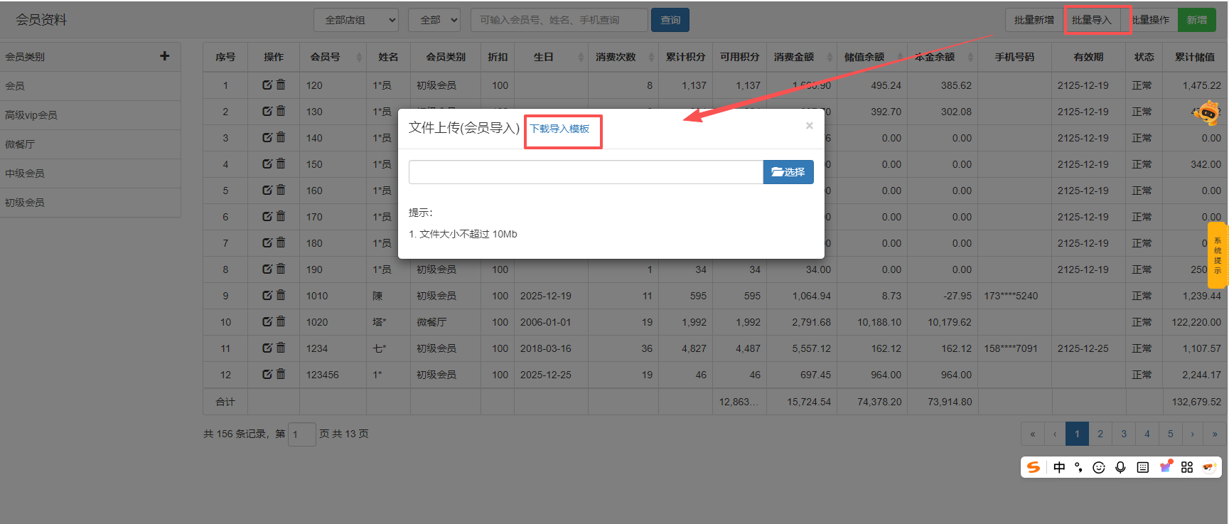 在弹出的窗口中,点击【下载会员导入模版】,将Excel模板保存到本地。