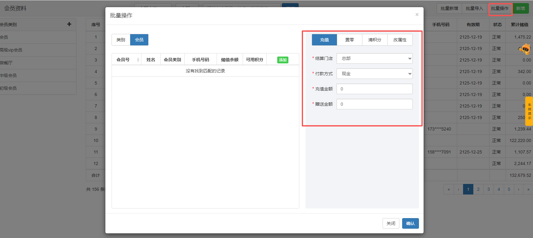 批量操作用于对多个会员进行统一管理,支持批量充值、置零(清零储值余额)、清积分、修改属性等操作,大幅提升会员管理效率,适用于节日统一充值、积分清理、会员等级调整等场景