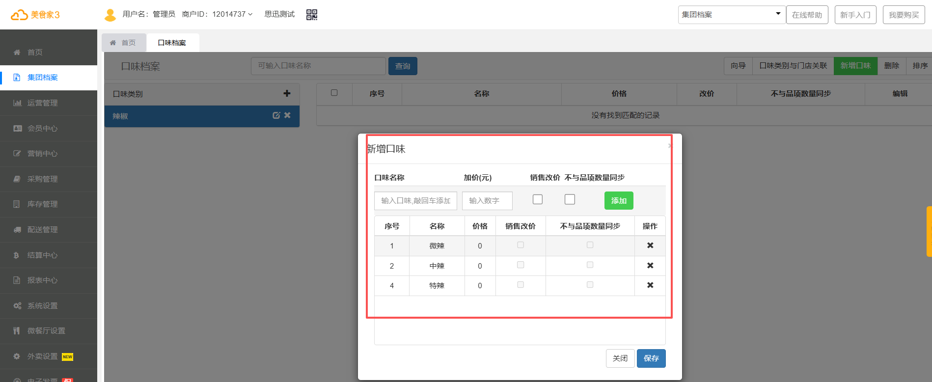 4.选择对应的口味类别,再点击“新增口味”新增口味信息,之后再录入口味名称和相应价格,点击保存即添加成功。