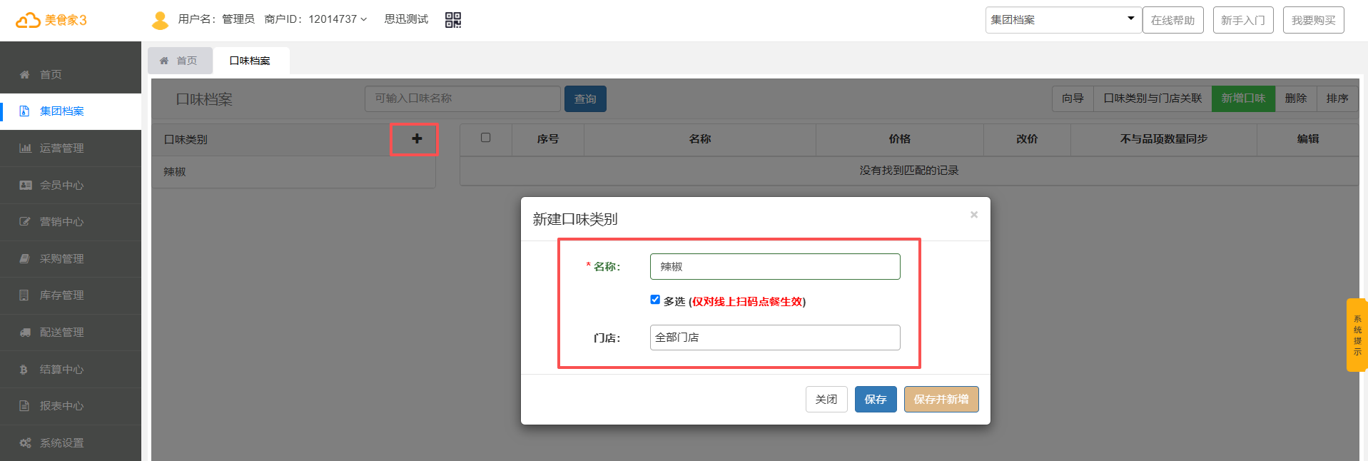 2.先添加口味类别,点击“+”号,输入名称,选择对应门店然后保存,口味类别即可新增成功。