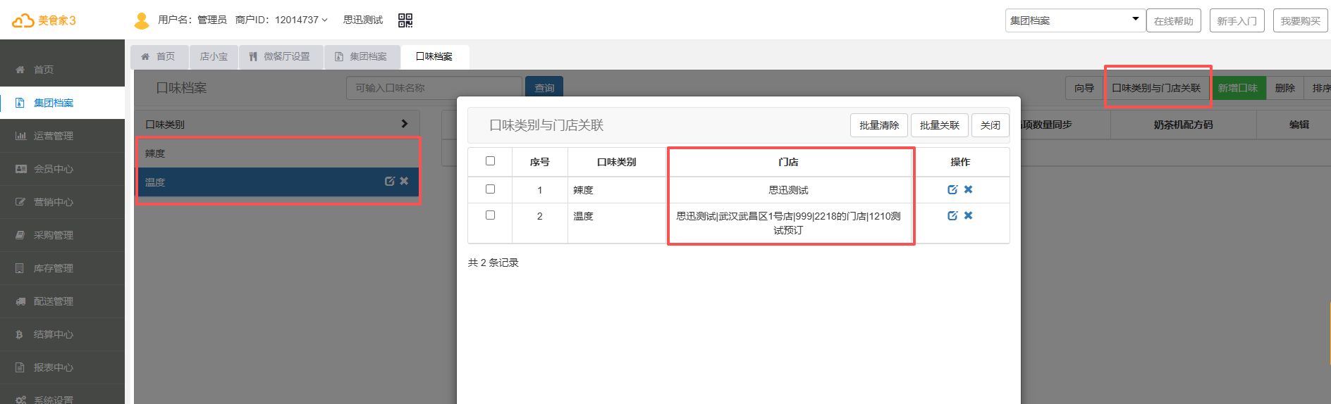 3.选择对应的口味类别,点击口味类别与门店关联,可针对单个口味类别关联门店也可以批量关联或批量清除。