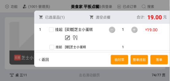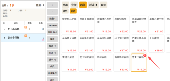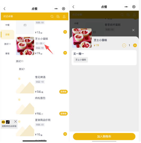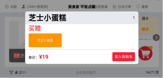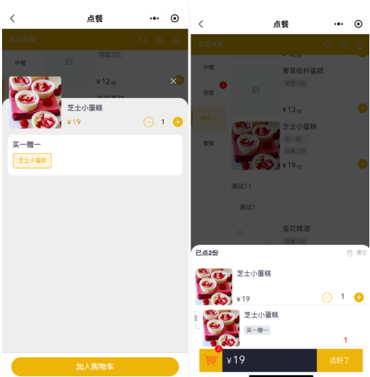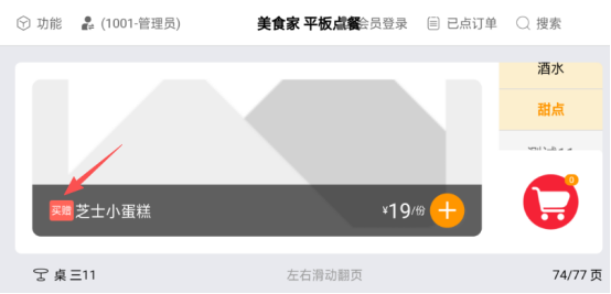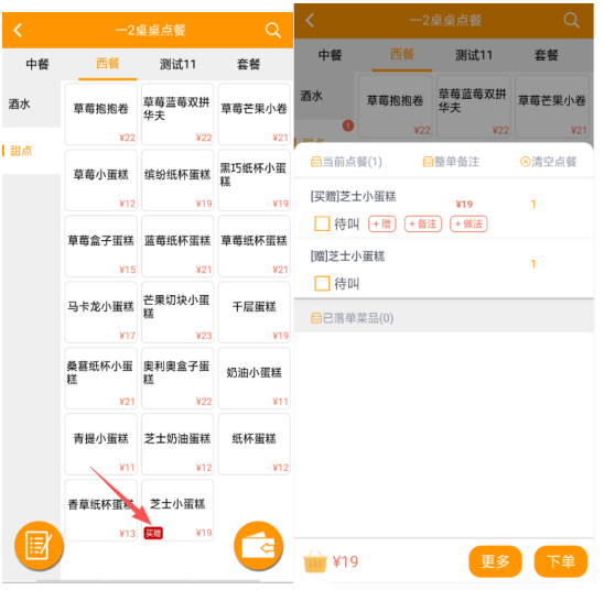 商品右上角带“送”字标识,每点一份商品自动带出赠送的一份。