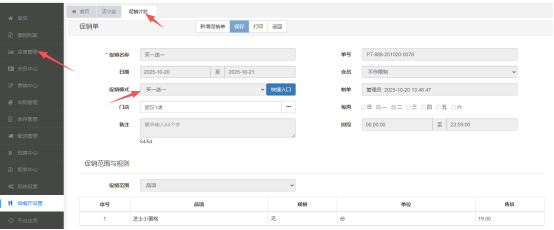 后台运营管理-促销计划中,新增促销单,促销模式选择买一送一。