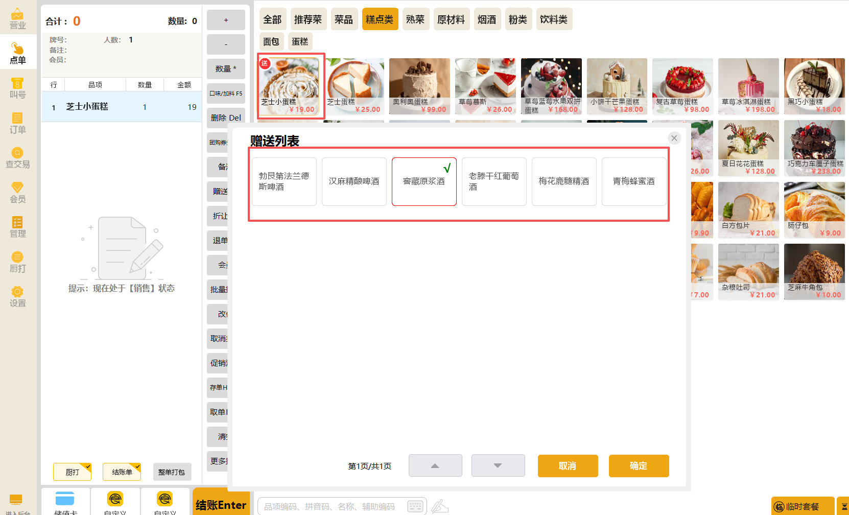 前台POS显示效果:参与活动的菜品右上角会有赠送标识,选中该菜品后,会弹出赠送品项列表供选择,选择一个赠送品项,点击确定即可加入订单。