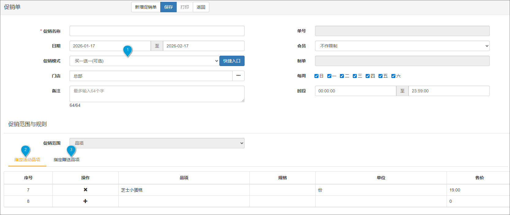 1、在促销计划中点击【新增促销单】,促销模式选择买一送一(可选)。