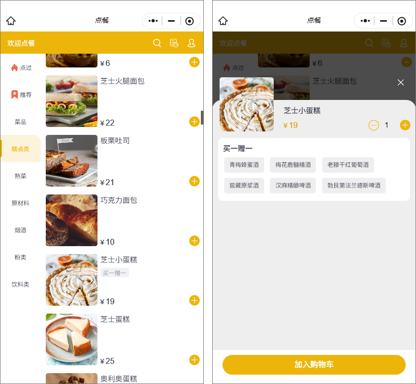 扫码点餐显示效果:菜品下方会显示买一赠一标识,选中菜品后,会弹出赠送菜品列表,选择赠送菜品后下单即可。