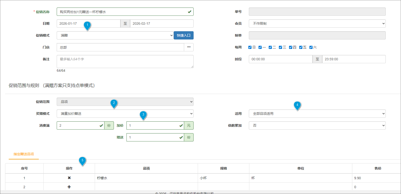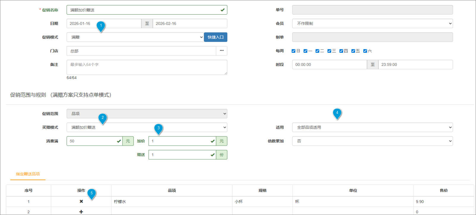 示例:全部品项购买满2份,加价1元,赠送1杯柠檬水。