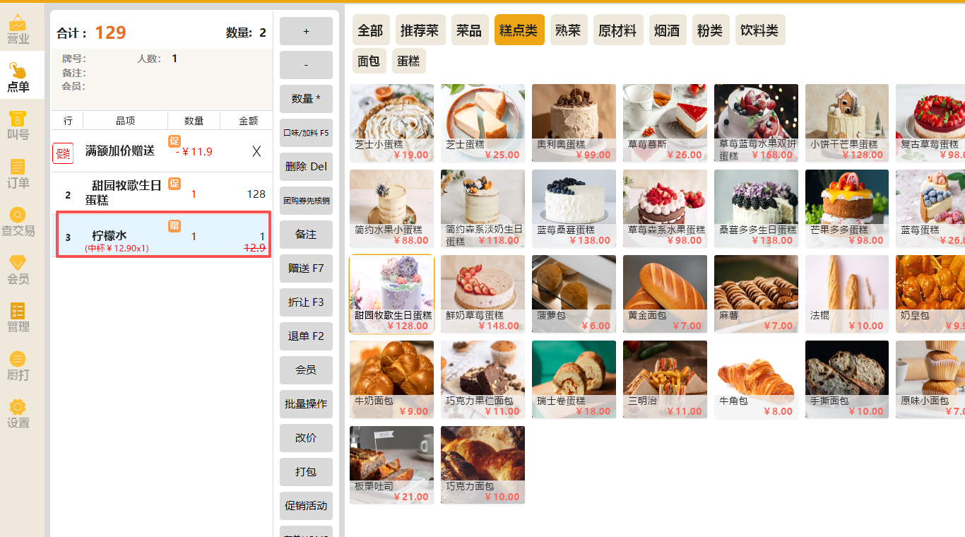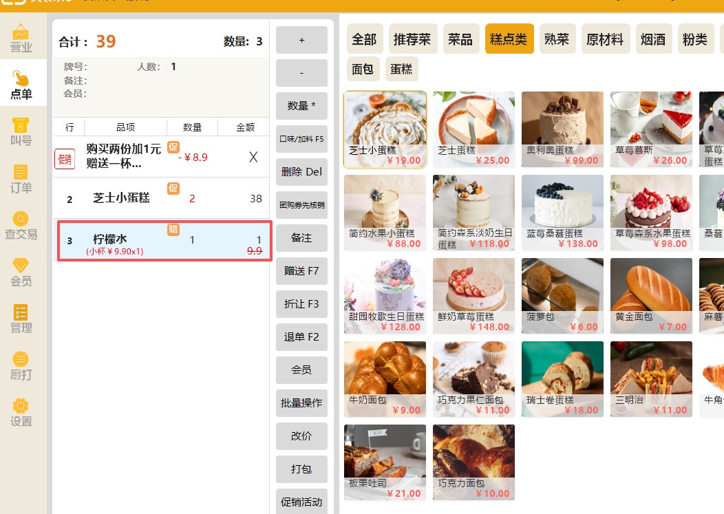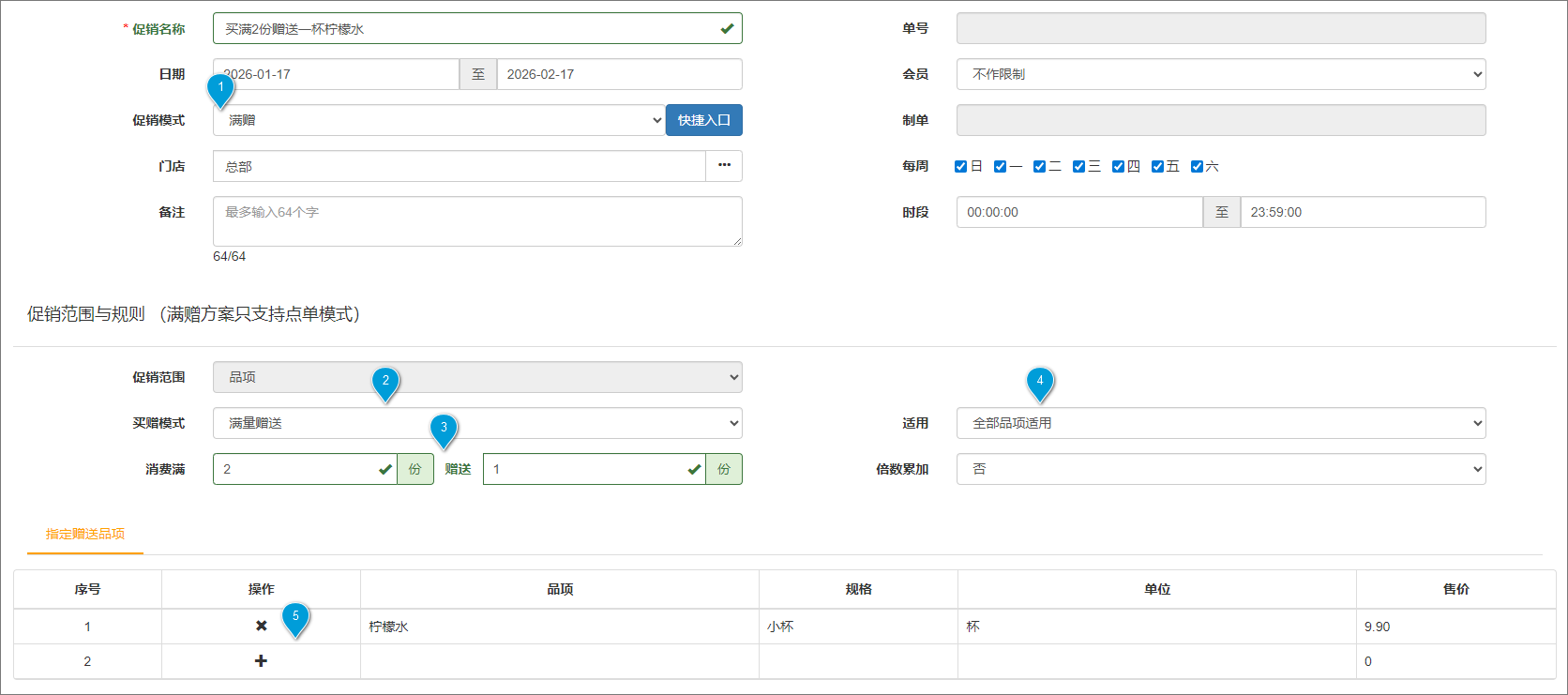 后台设置:示例:全部品项购买满2份,赠送1杯柠檬水。