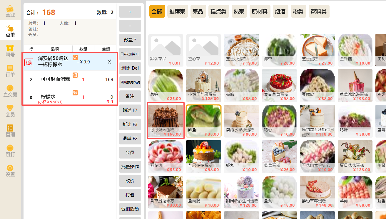 加入点菜列表的商品满50即赠送柠檬水,并且该赠品自动以1元进行销售;