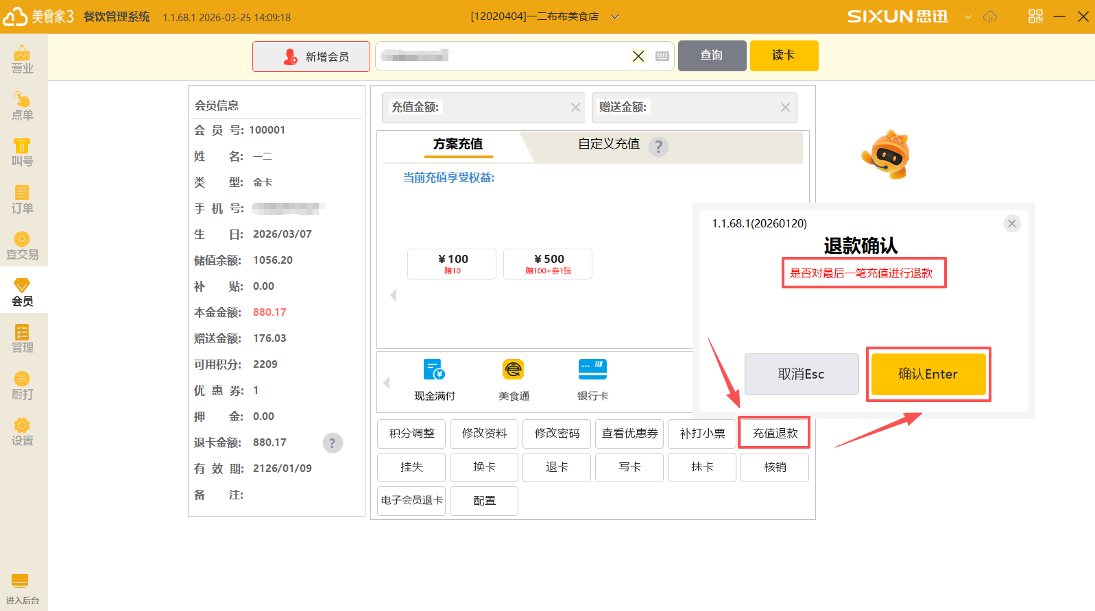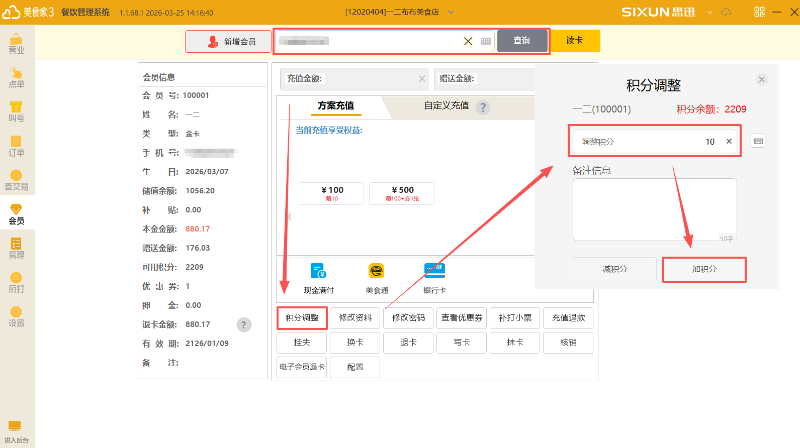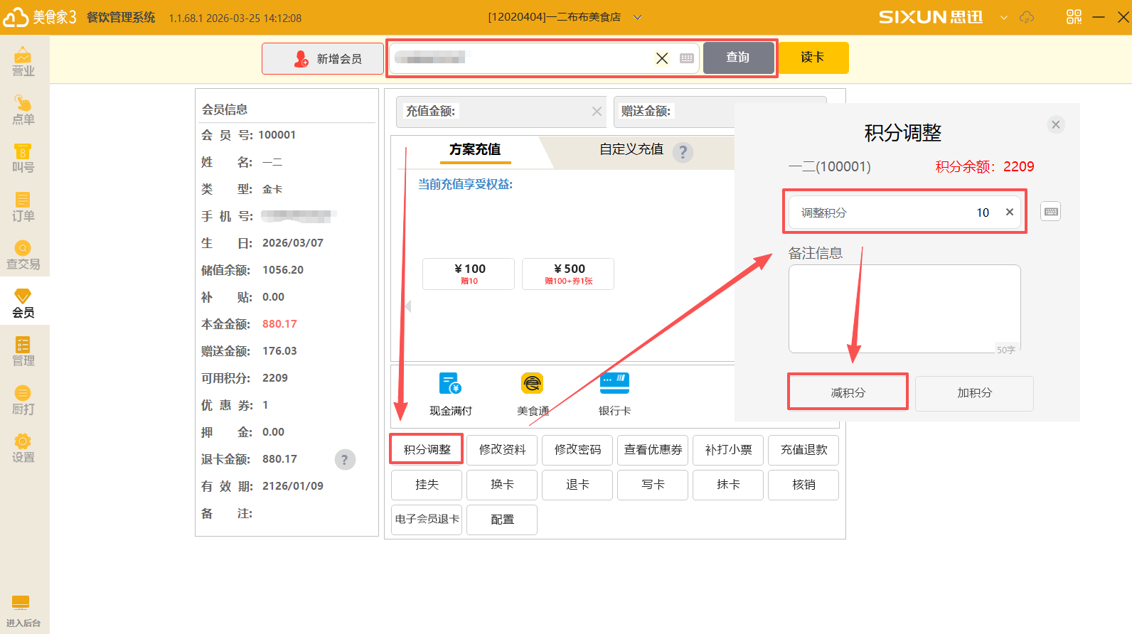 (1)点击会员功能模块——输入会员号查询。