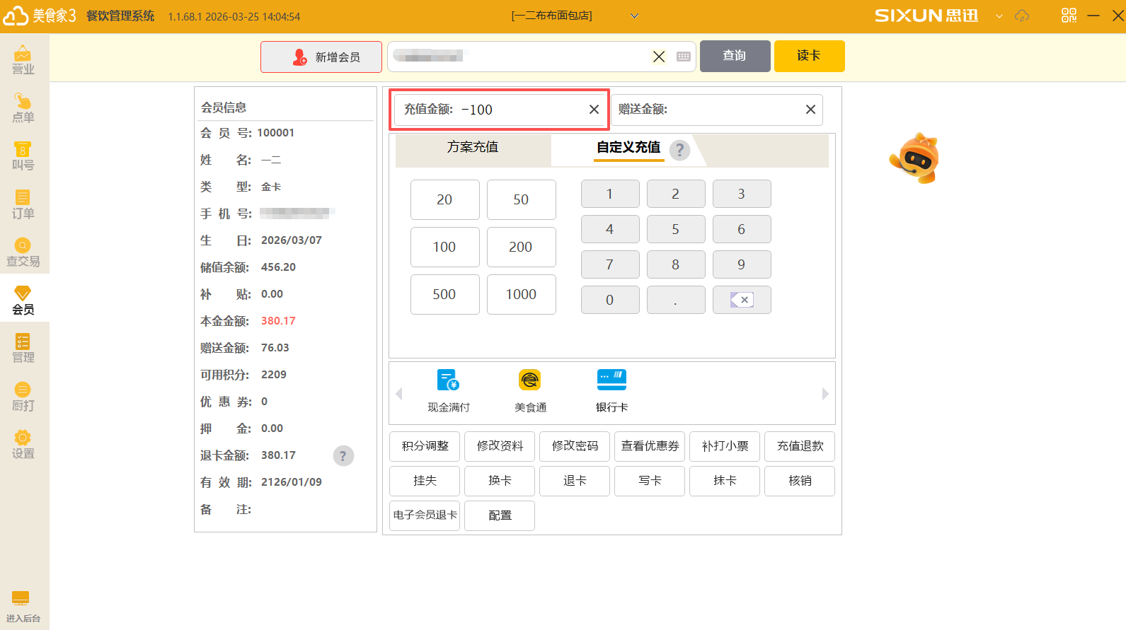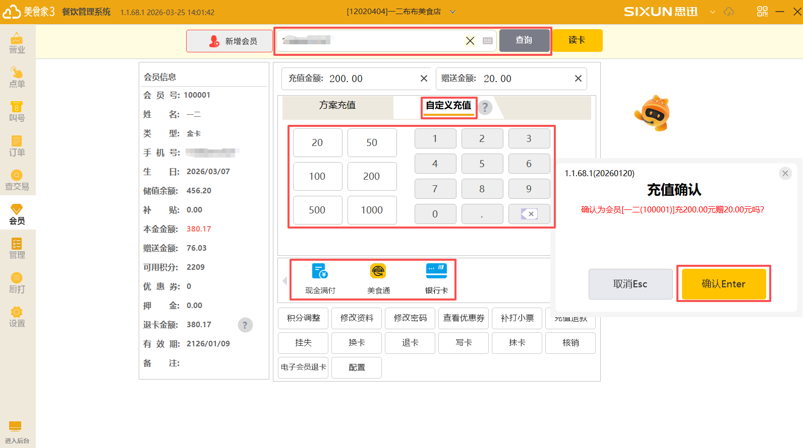 (2)使用读卡功能自动触发查询会员。(仅刷卡模式)