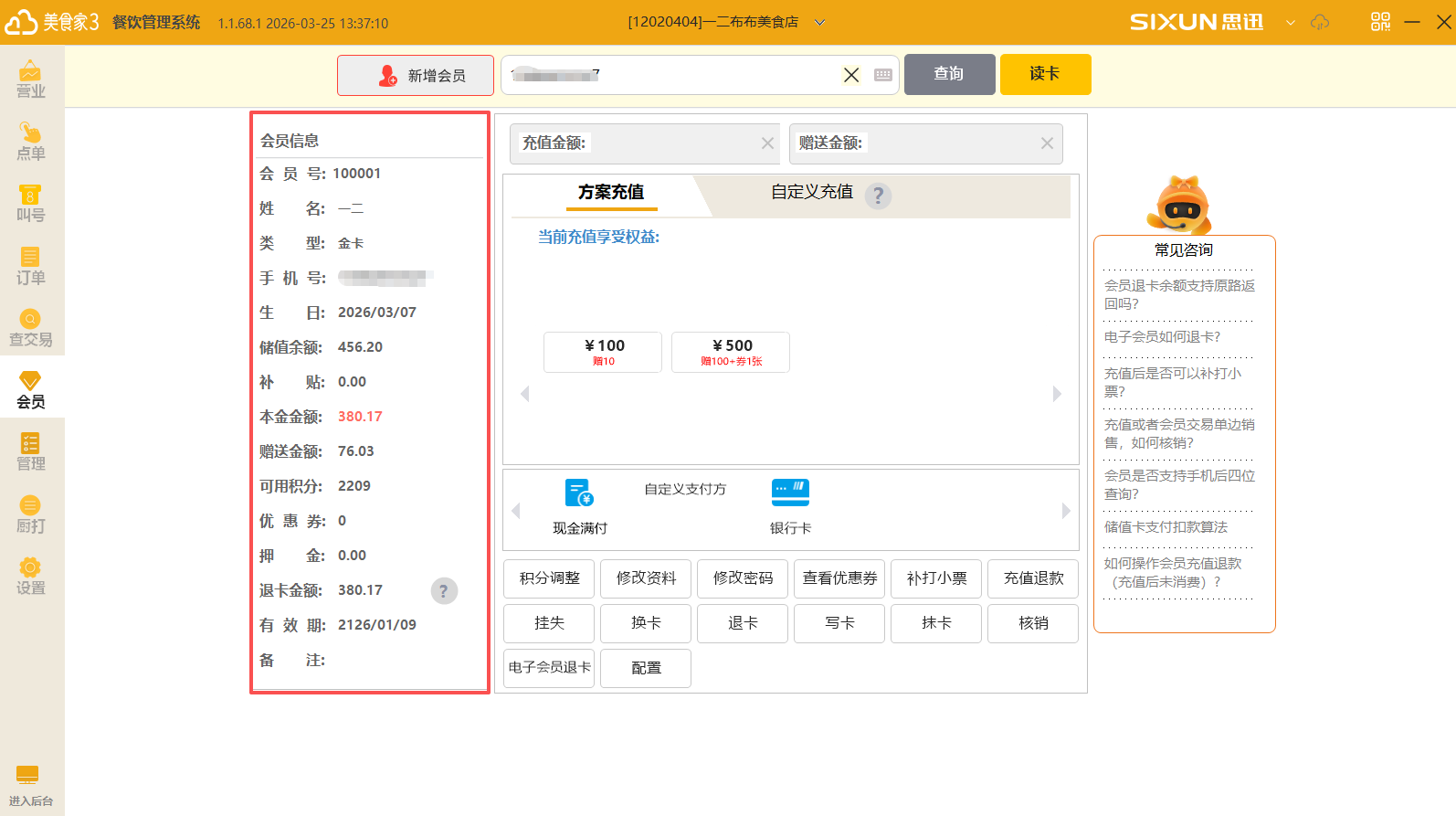 提供多途径会员查询、充值、积分等功能,支持刷卡、扫码、手动输入等多种查询方式,可查看会员账户余额及基础信息。