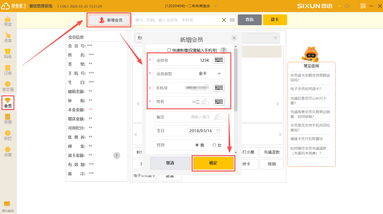 (2)在弹出的窗口中填写会员号,会员类型,手机号,姓名等必填信息后确定即可新增成功。(红色*号的均为必填项)