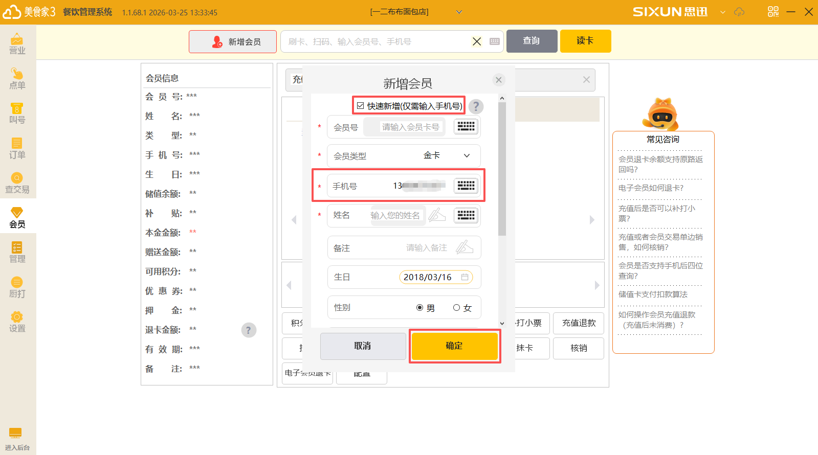 (2)在弹出的窗口中勾选“快速新增”,仅需要录入手机号即可完成注册,手机号即会员号。勾选后下次自动为勾选状态。