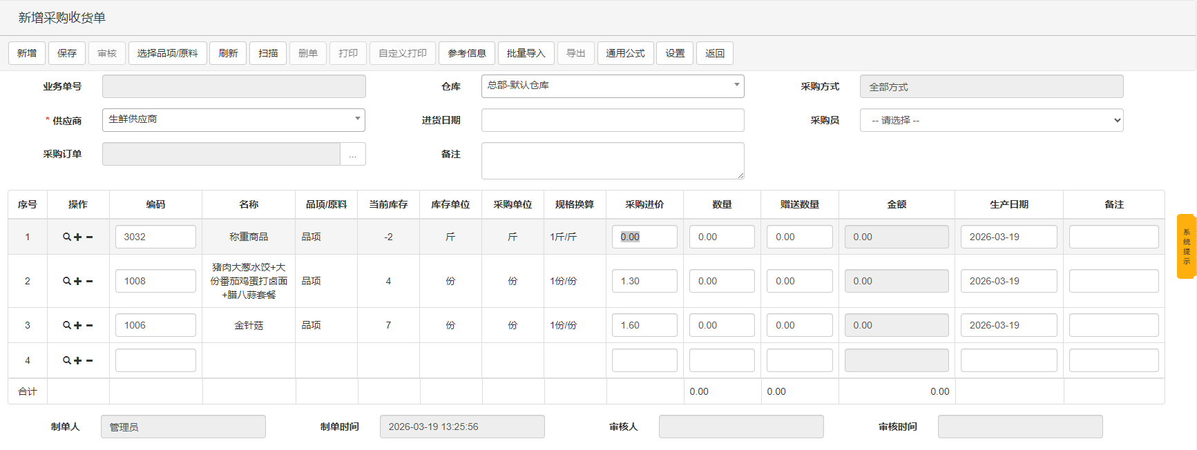 (1)在新增采购收货单时,可以点击采购订单“…”引用已经做好的采购订单。