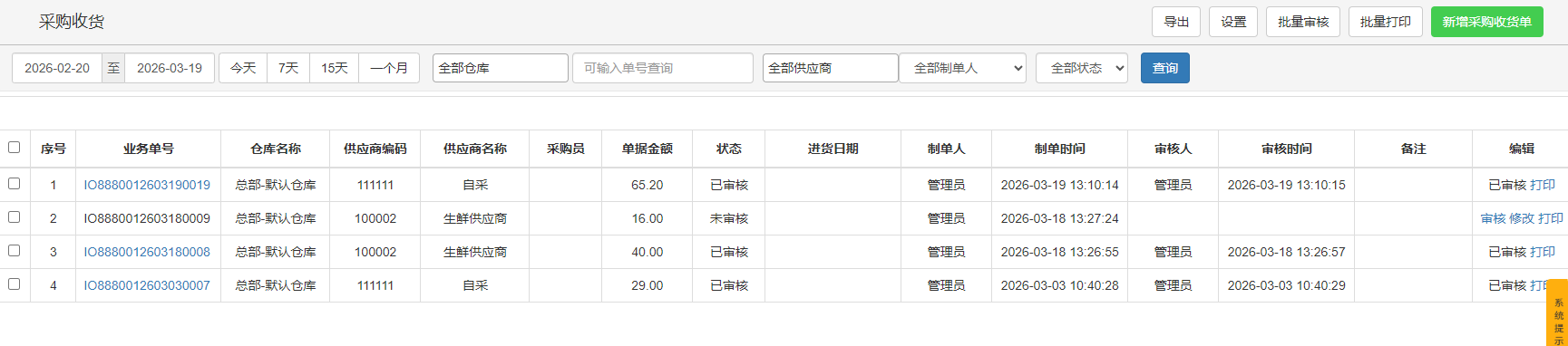 在采购订单列表中,默认显示今天本门店的所有的采购收货单。