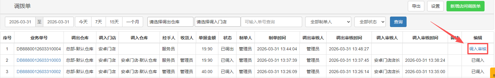 用于门店做调入审核,单据是从调拨单中创建并保存调出后,在门店调拨单单列表中自动生成待调入审核的单据,由收货方进行调入审核。