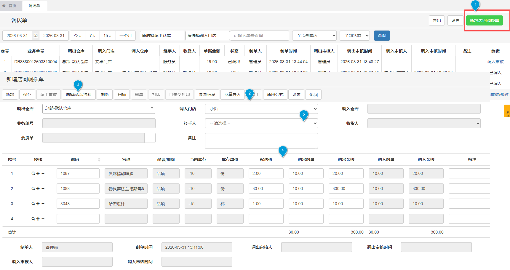 新增调拨单,选择调入门店,选择调拨品项,填写数量金额,选择经手人,核实无误后保存审核;