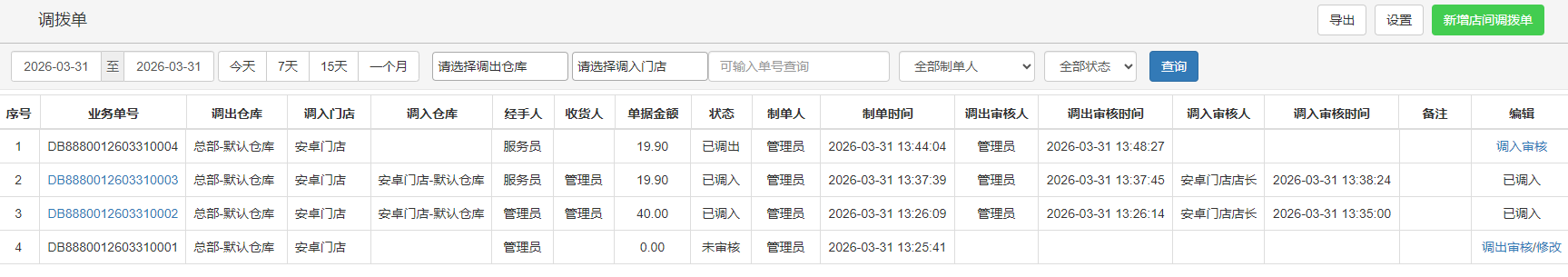默认当天的数据,可以查询所有门店的调拨单数据;