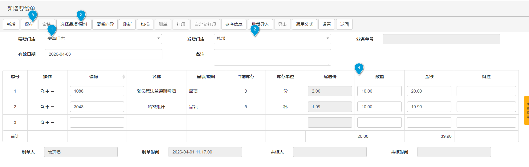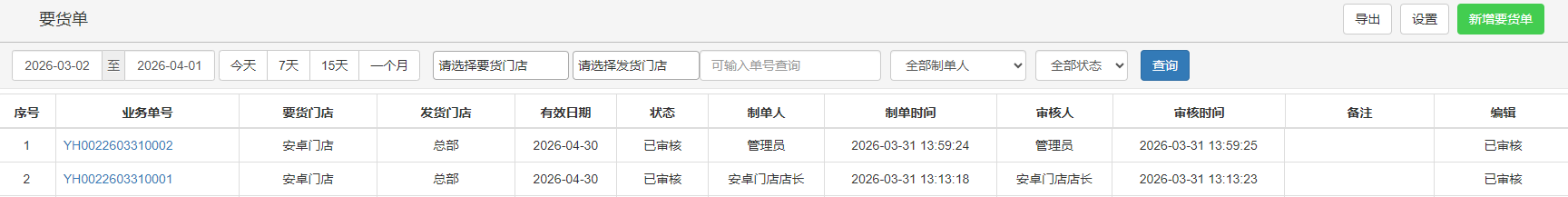 功能概述:要货单用于门店向配送中心发起要货申请,是连锁配送业务的核心单据。通过要货单,门店可根据实际销售需求,向配送中心申请补货,配送中心依据要货单进行配货并生成调拨单,完成货物配送。