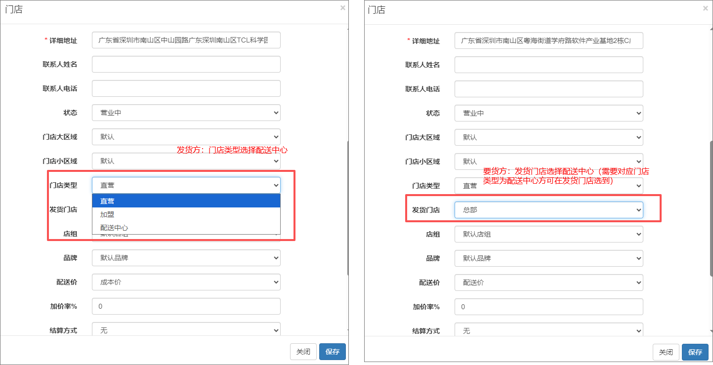 发货门店需在【集团档案】->【门店管理】中门店类型设置为配送中心。