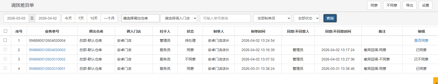 打开差异单,查看单据详情,如分店没有收货的部分商品送回到总部,总部核对数量无误后,可对差异单做同意处理;如总部不同意,可做不同意处理。