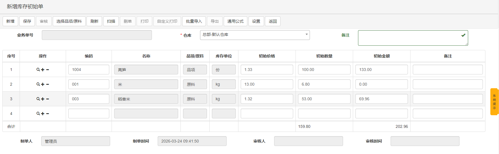 功能概述:库存初始化设置用于商户首次启用库存管理时,对各个仓库的期初库存数量和成本进行一次性初始化录入。通过此功能,可将现有库存数据导入系统,确保后续采购、销售、调拨等业务基于准确的期初库存展开。初始化单据审核成功后,系统将自动更新对应品项/原料的库存信息,并作为后续成本核算的基础。