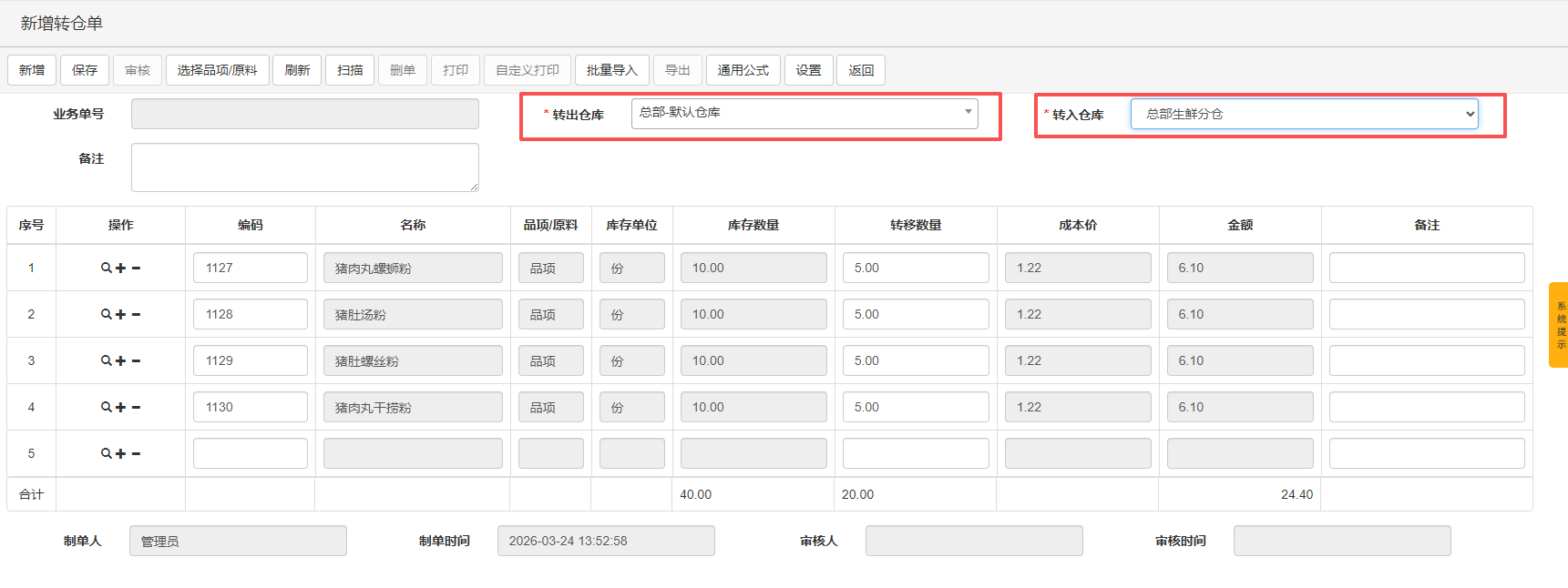 (2)转仓单单据单价默认取商品成本价,不影响商品成本。